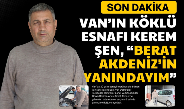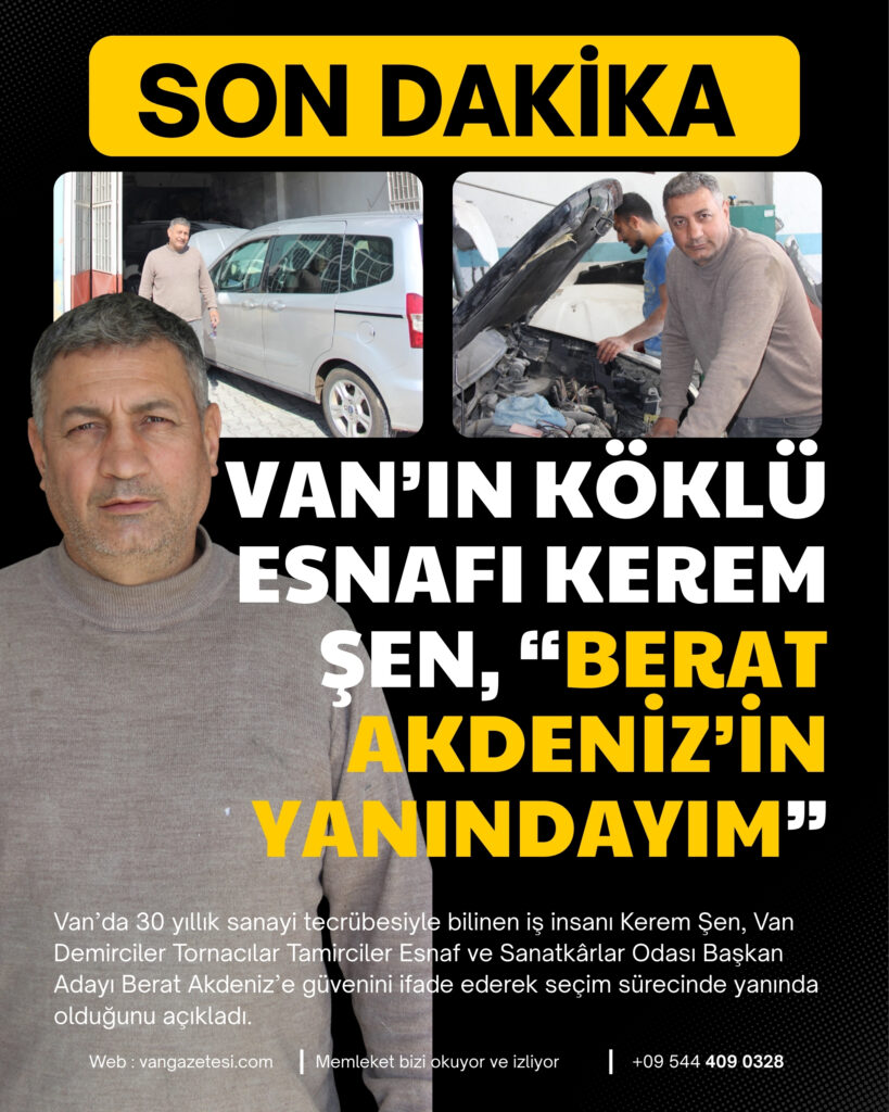 Van sanayi sektöründe 30 yıllık tecrübesiyle tanınan iş insanı Kerem Şen, Van Demirciler Tornacılar Tamirciler Esnaf ve Sanatkârlar Odası Başkan Adayı Berat Akdeniz’e destek verdi. Şen, esnaflık geçmişleri ve Akdeniz’in çalışkanlığı ile dürüstlüğüne olan güveni nedeniyle seçim sürecinde onunla birlikte yürümeye hazır olduklarını söyledi.
